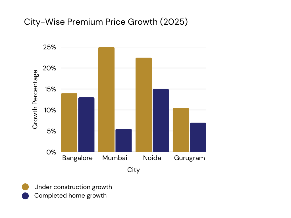 In cities like Mumbai and NOIDA, the range of growth was particularly wide (up to 36 percent), while Bangalore maintained healthy gains of 13–15 percent for under-construction premium assets.